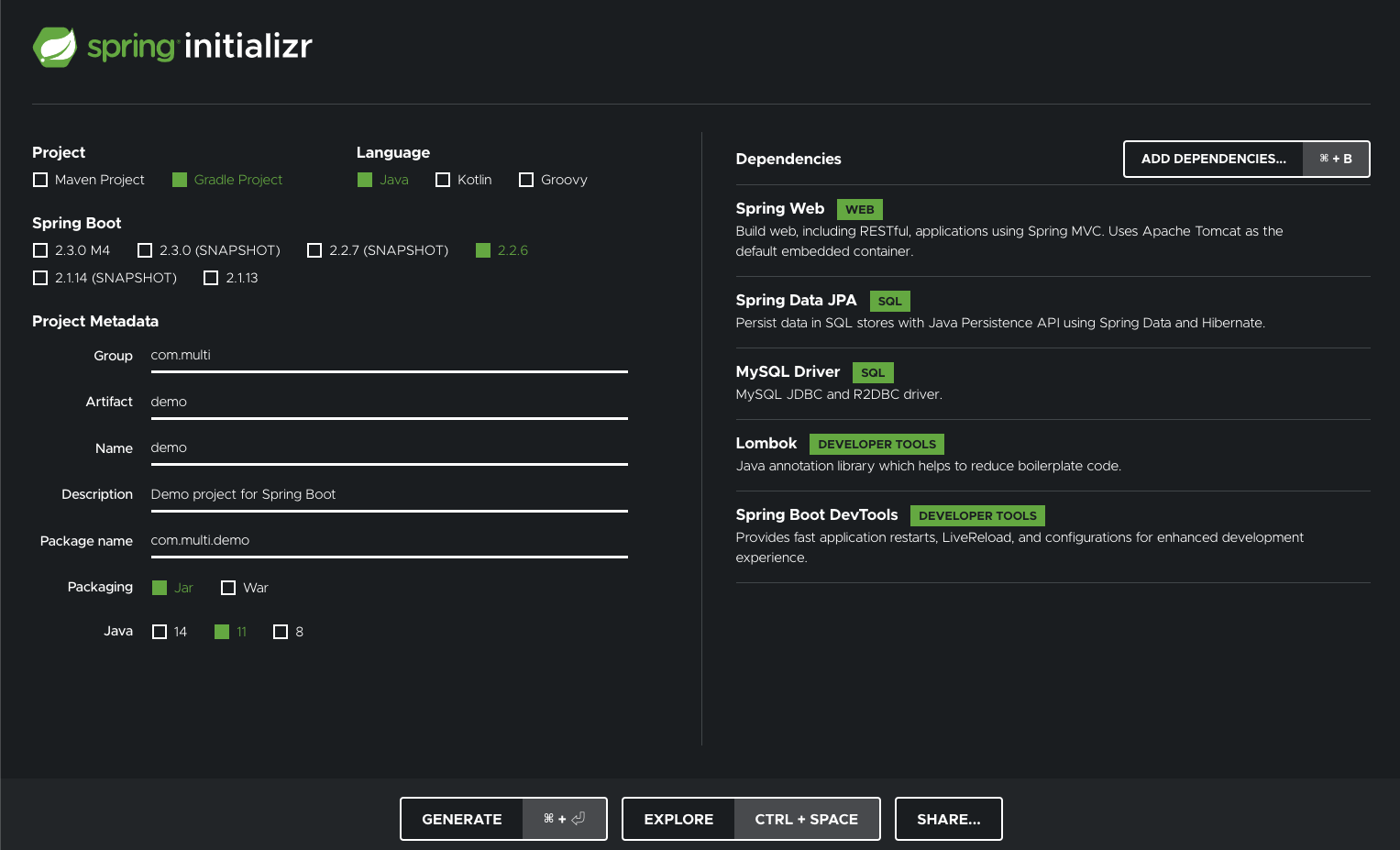 디펜던시로는 Spring Web, Spring Data JPA, MySql, Lombok, Spring Boot Devtoos를 일단 넣었다.