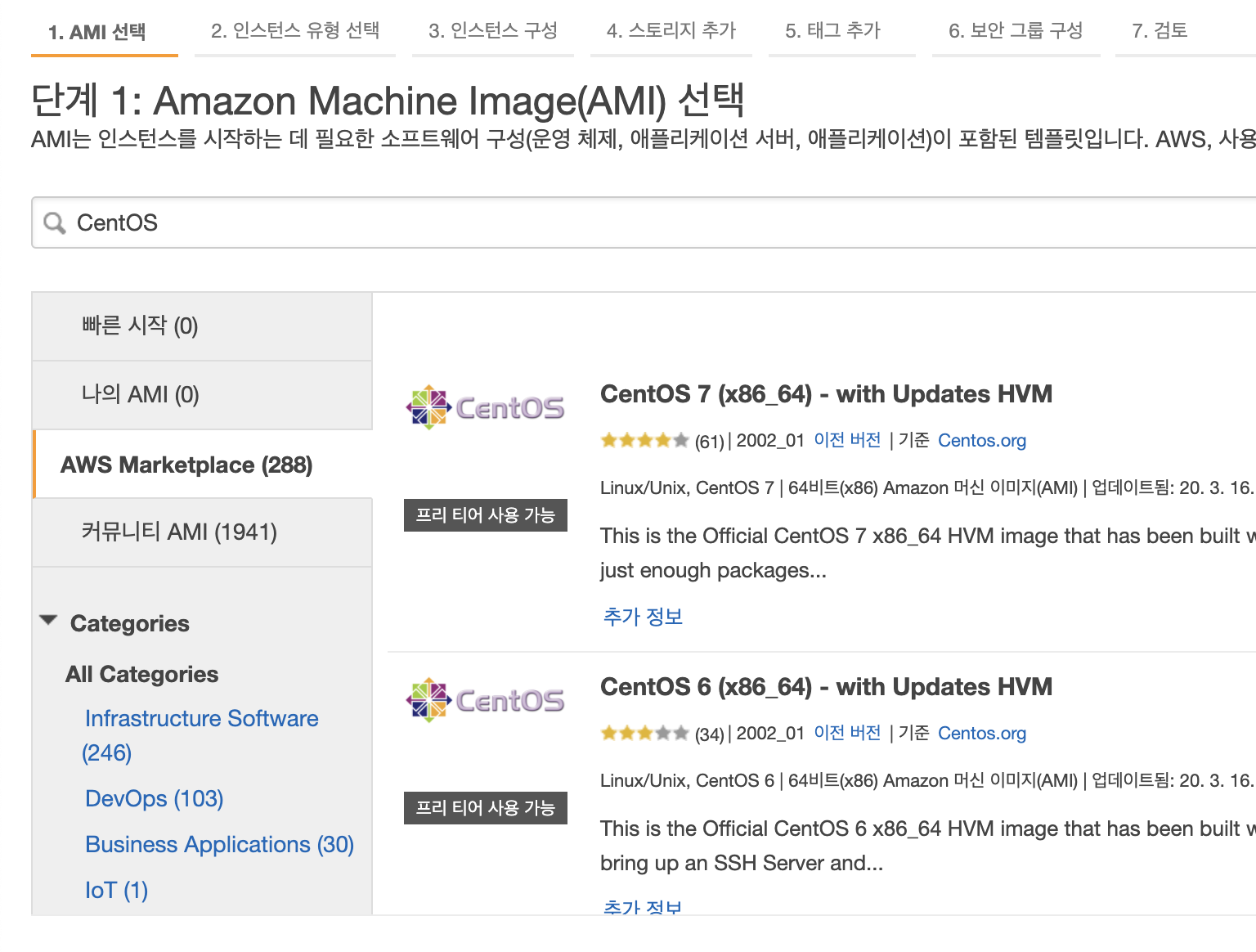 첫화면에서 검색창에 CentOS로 검색 후 CentOS 7을 선택한다.
