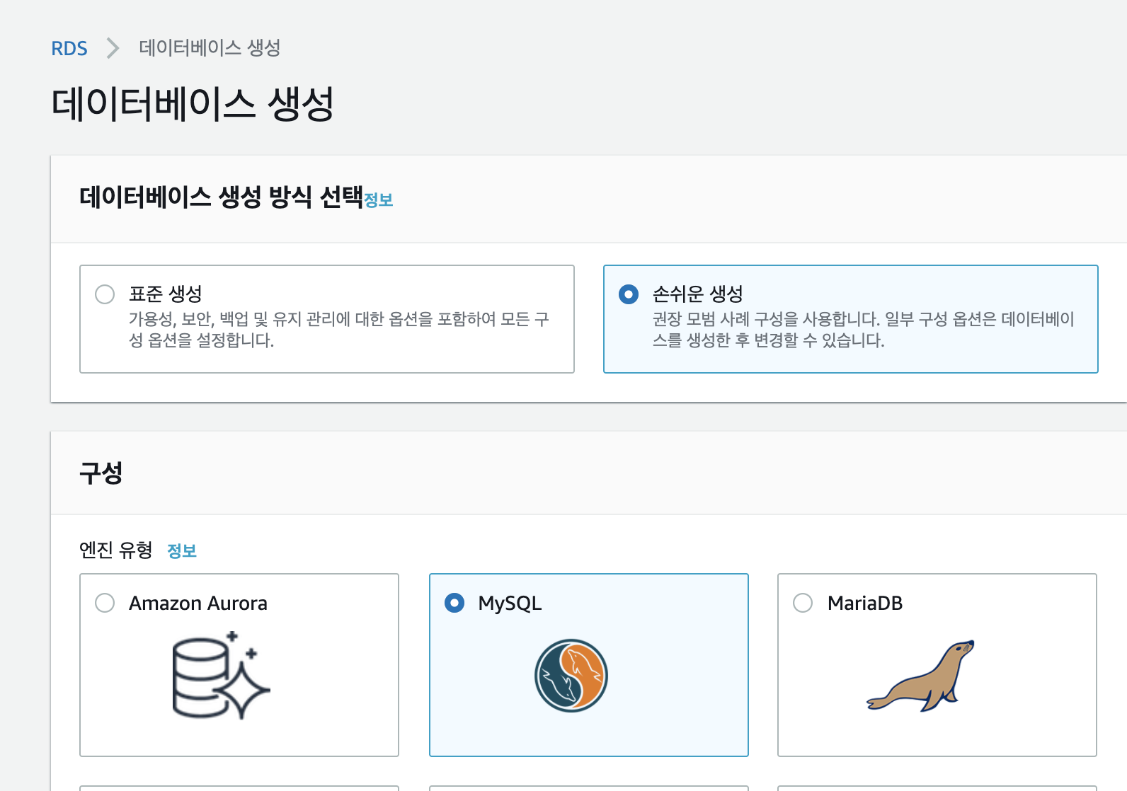 손쉬운 생성으로 하고 MySql을 선택한다.