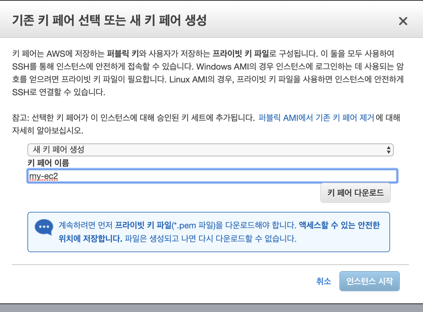 새 키 페어 생성을 선택하고 키페어 이름은 임의대로 정해서 다운로드 한다.