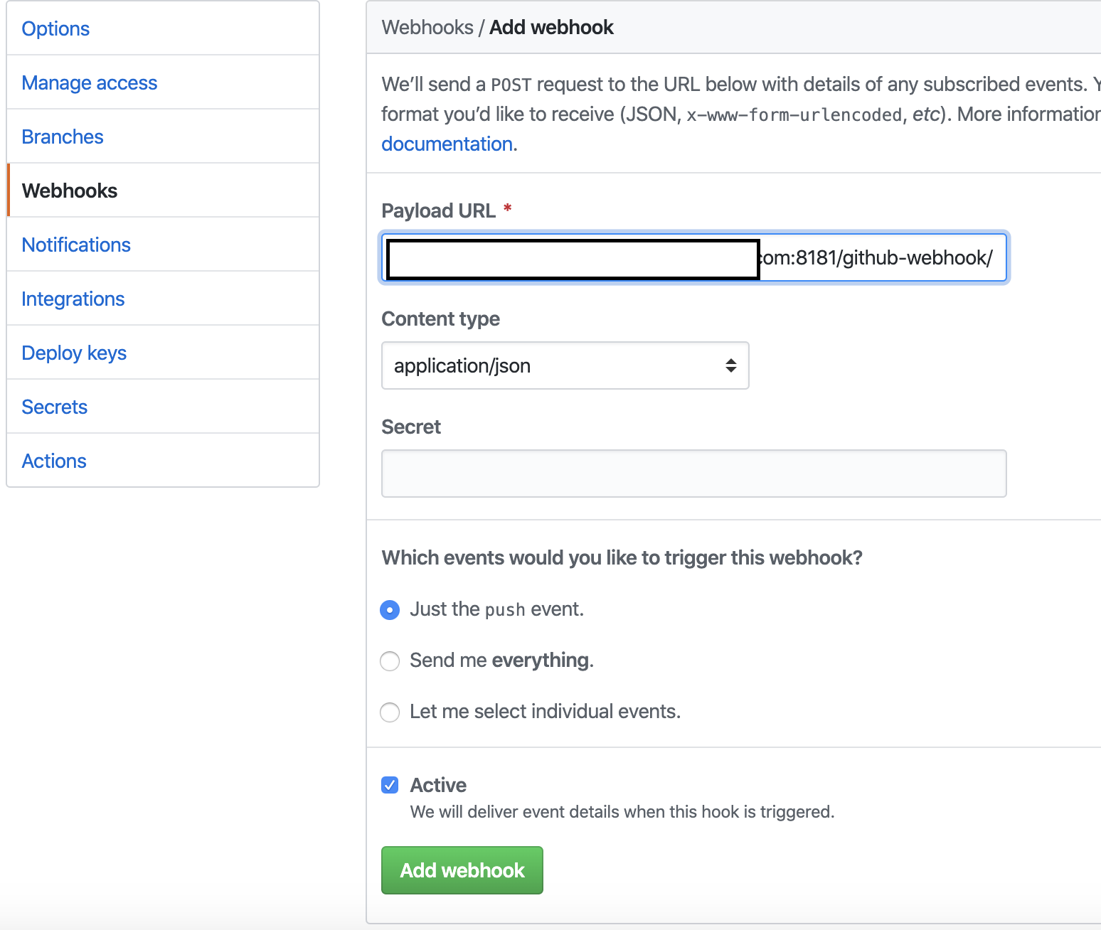 여기서 주의할점은 뒤에 /github-webhook/를 꼭 붙여줘야 한다.