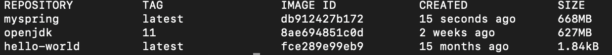 빌드가 수행되면 명령어로 image를 확인합니다.
