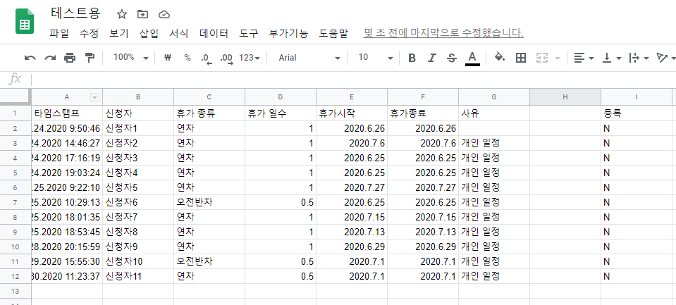스프레드시트 - 설문지 폼 - 캘린더가 자동으로 동기화되며 데이터를 업데이트 하던 기능이 유료화되었다.