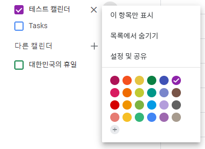 캘린더 추가 - 추가된 캘린더 우측 점점점 클릭 - 설정 및 공유 클릭